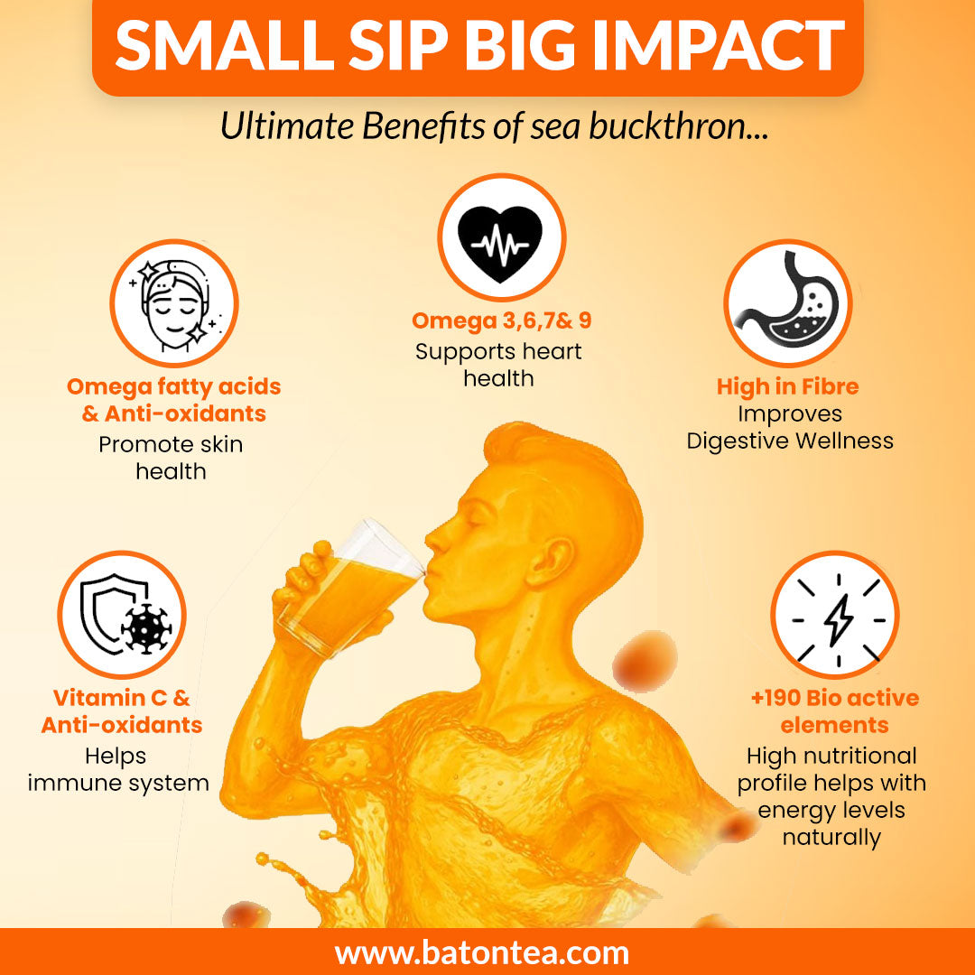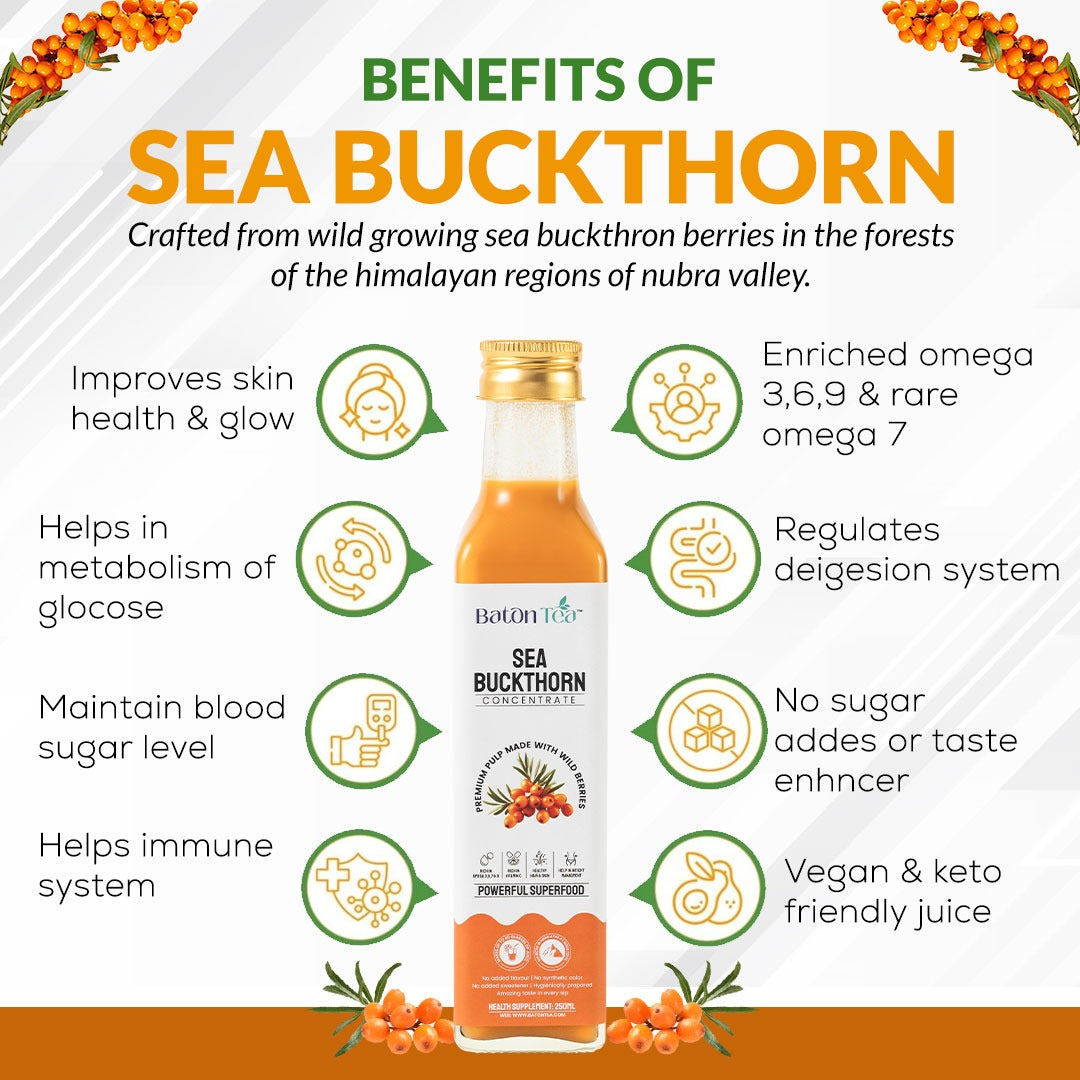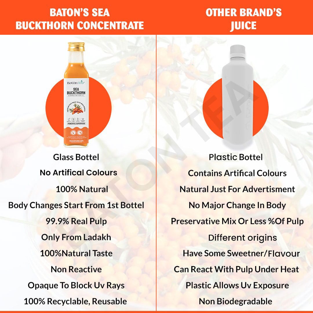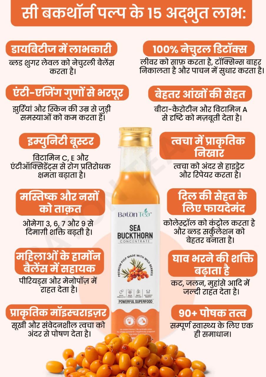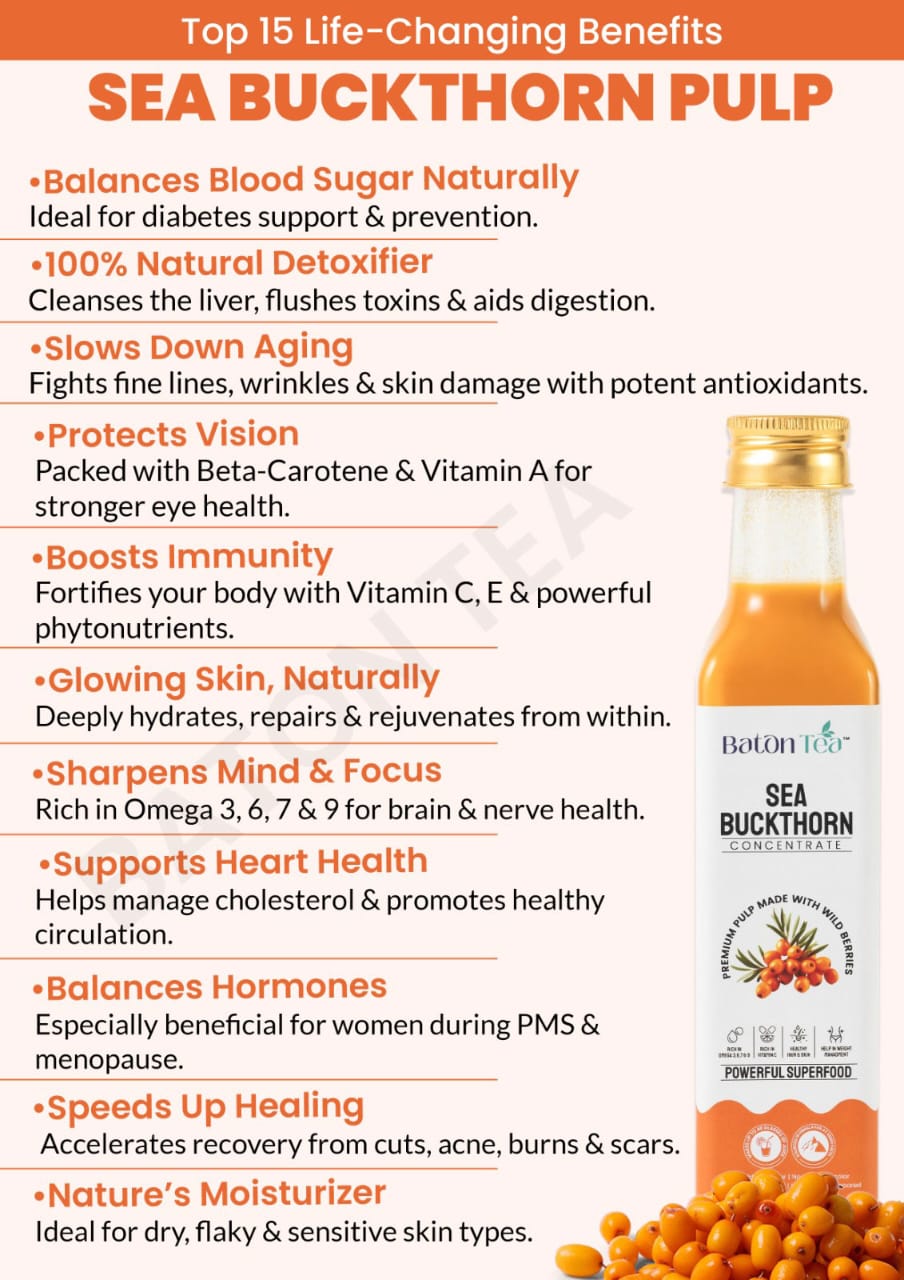 Baton Tea brings you authentic, Himalayan-sourced Sea Buckthorn Pulp. It’s cold-processed to retain all nutrients—no dilution, no shortcuts. Buy Sea Buckthorn Pulp online from us and experience pure wellness in every spoon.