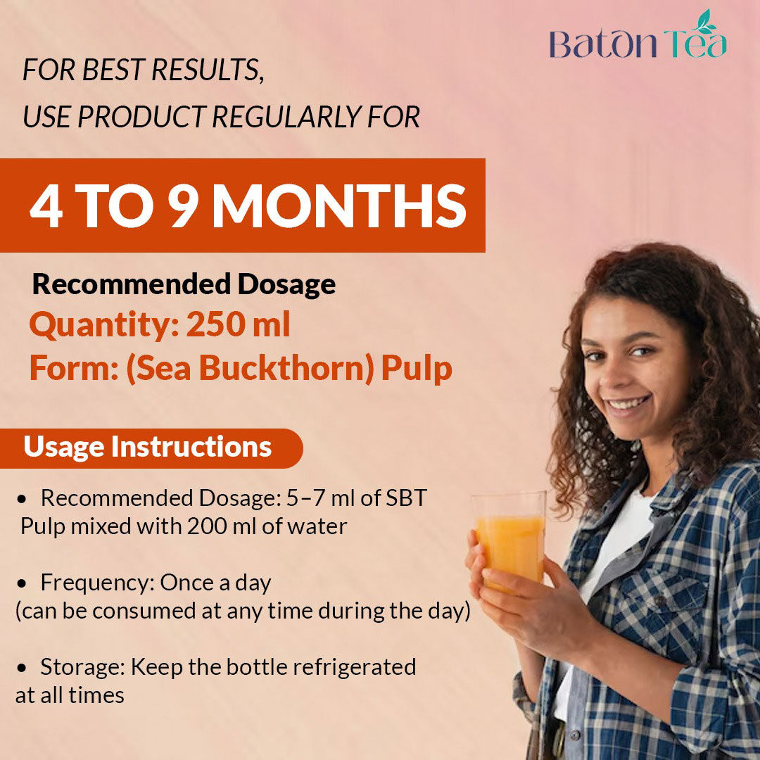 To enjoy the full benefits of Sea Buckthorn Pulp, consume 15–20ml daily. You can take it raw, mix it with warm water, or combine it with honey and lemon. For best results, consume Sea Buckthorn Pulp on an empty stomach.