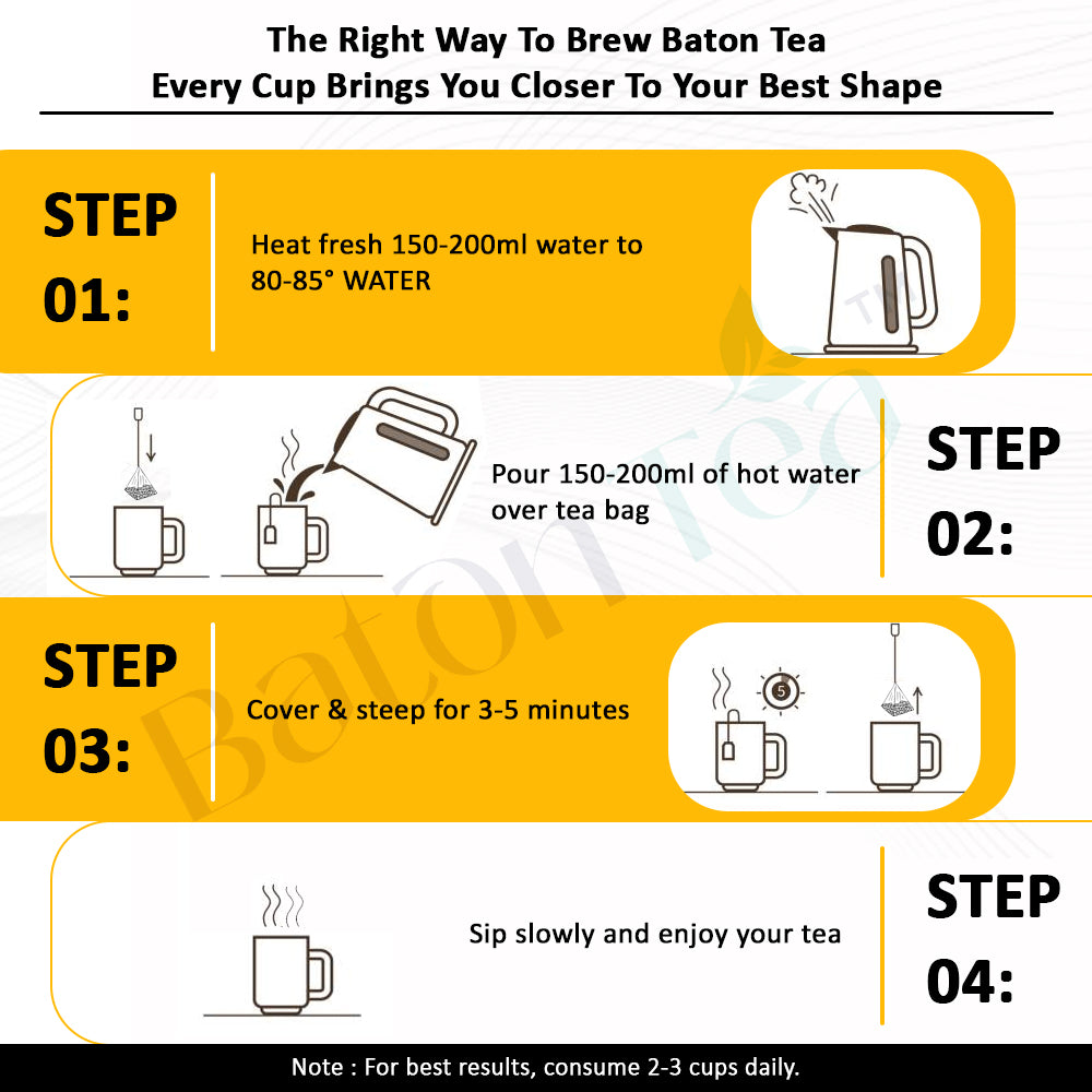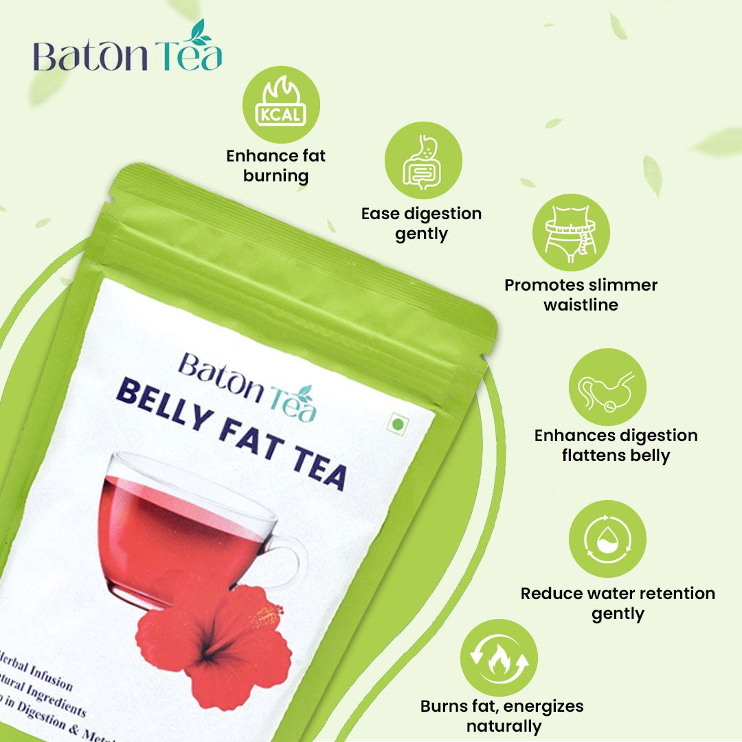 Baton Belly Fat Tea is a carefully crafted herbal blend designed to support your wellness and weight management goals. Made with a mix of green tea and 17+ natural herbs like tulsi, ginger, moringa, fennel, and ashwagandha, this tea works by boosting your metabolism, cleansing your system, and improving digestion. With its refreshing taste and earthy notes, Slimming Tea makes for a perfect daily companion on your fitness journey.