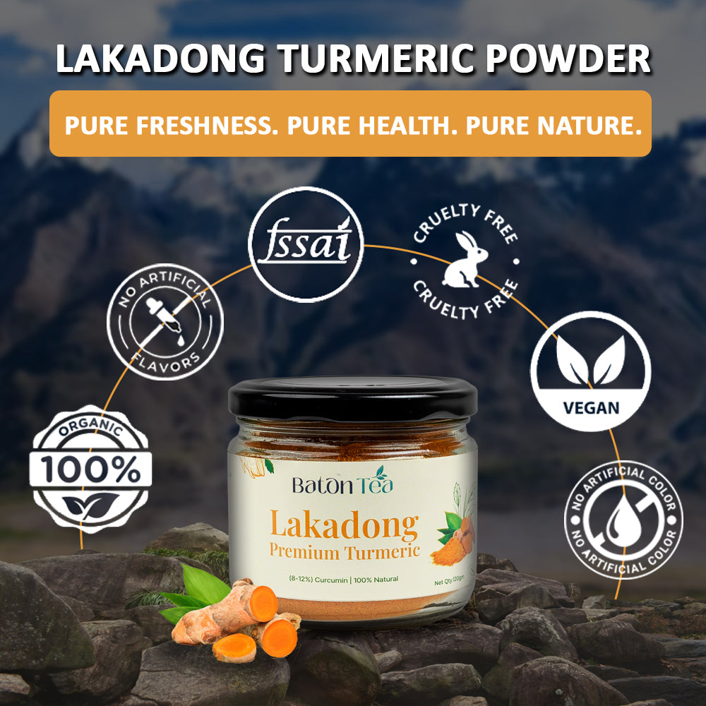 Description: Our Lakadong Turmeric, is a high-quality turmeric sourced from the pristine Jaintia hills of Meghalaya, India. Known for its exceptional potency and vibrant color, this turmeric variety is prized for its rich flavor and robust aroma. Packed with 8-12% curcumin, a powerful antioxidant and anti-inflammatory compound, Baton Lakadong Turmeric offers numerous health benefits. Sustainably sourced and carefully processed, it is a versatile ingredient that can be used in cooking, beverages, skincare, and more.