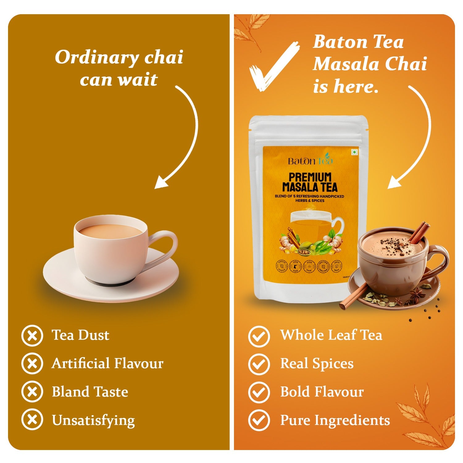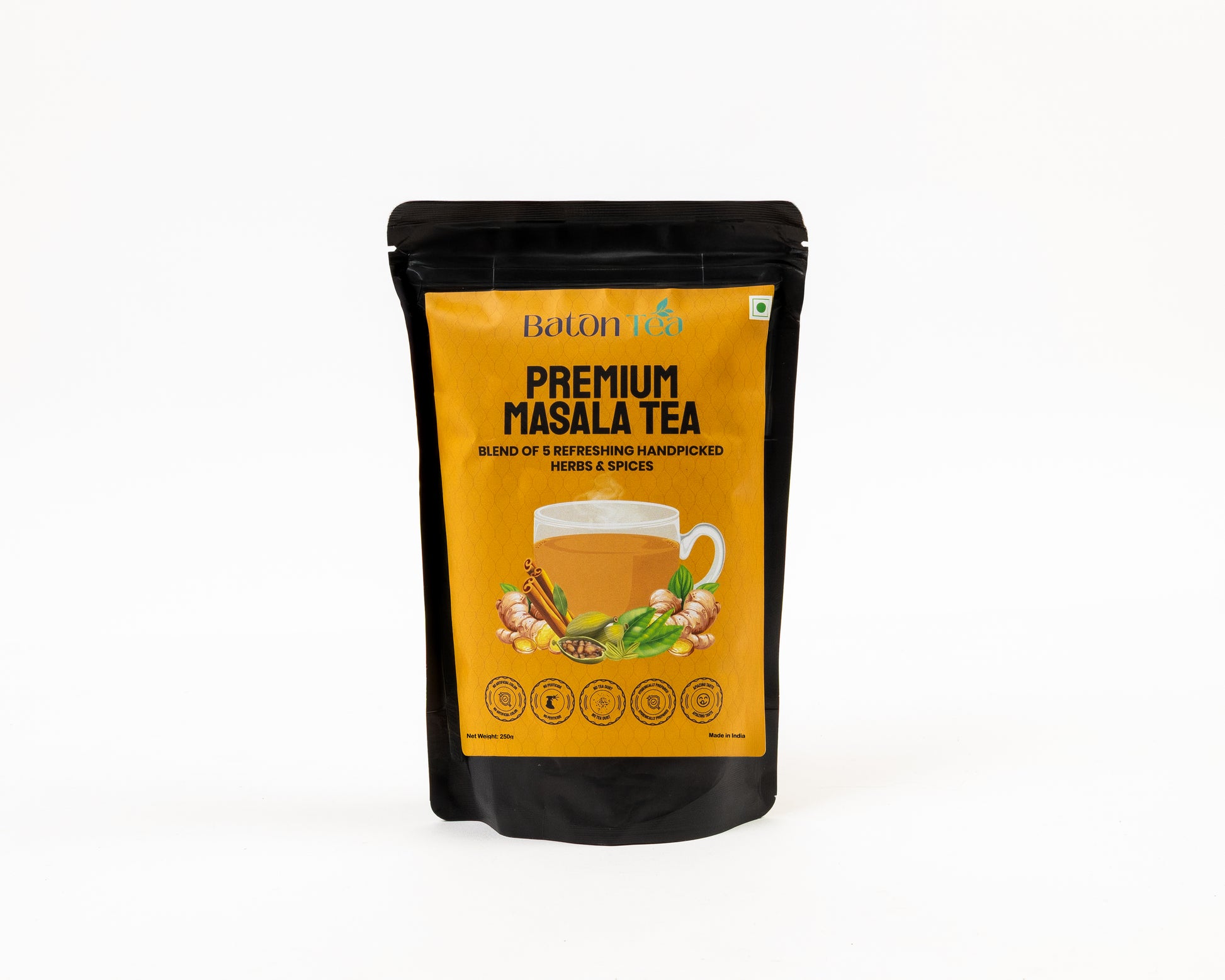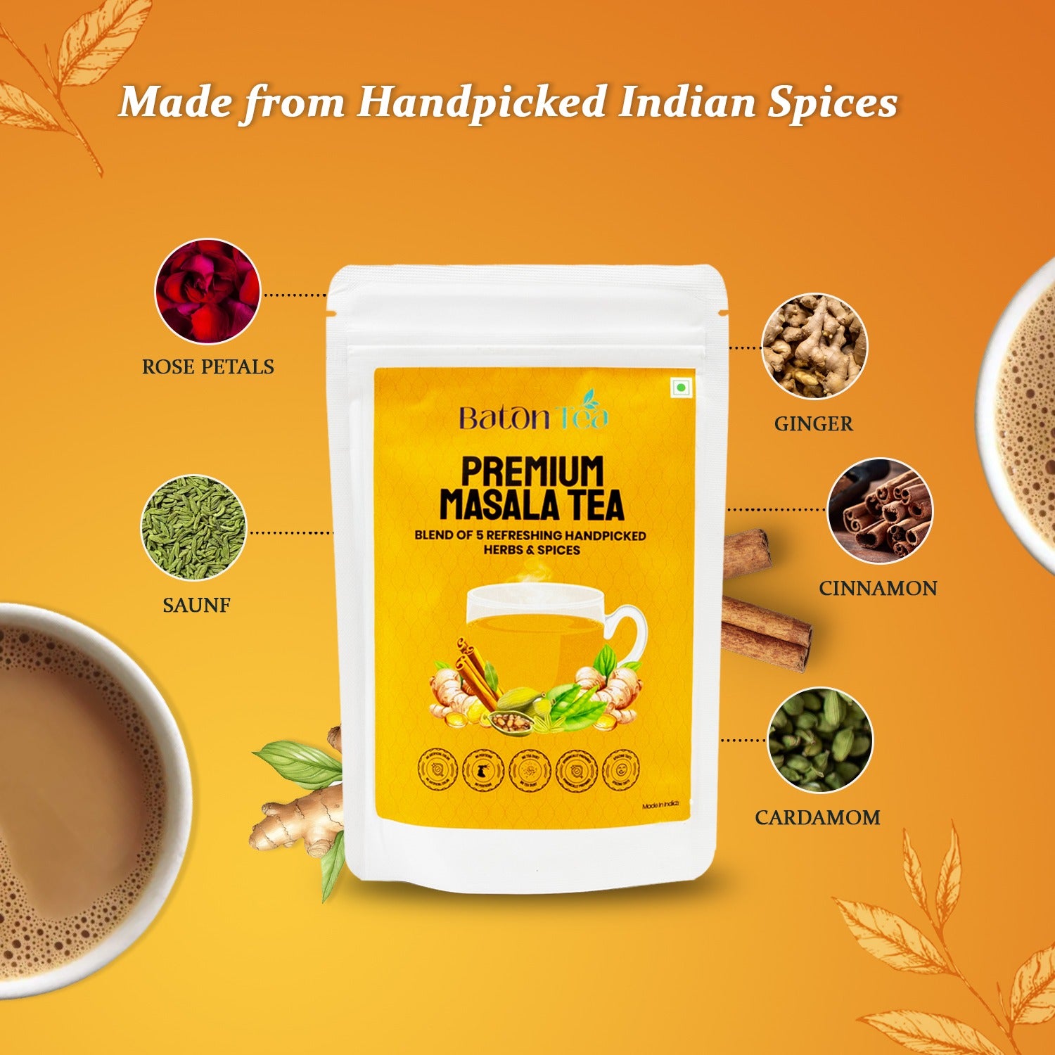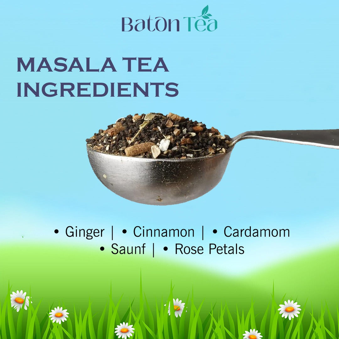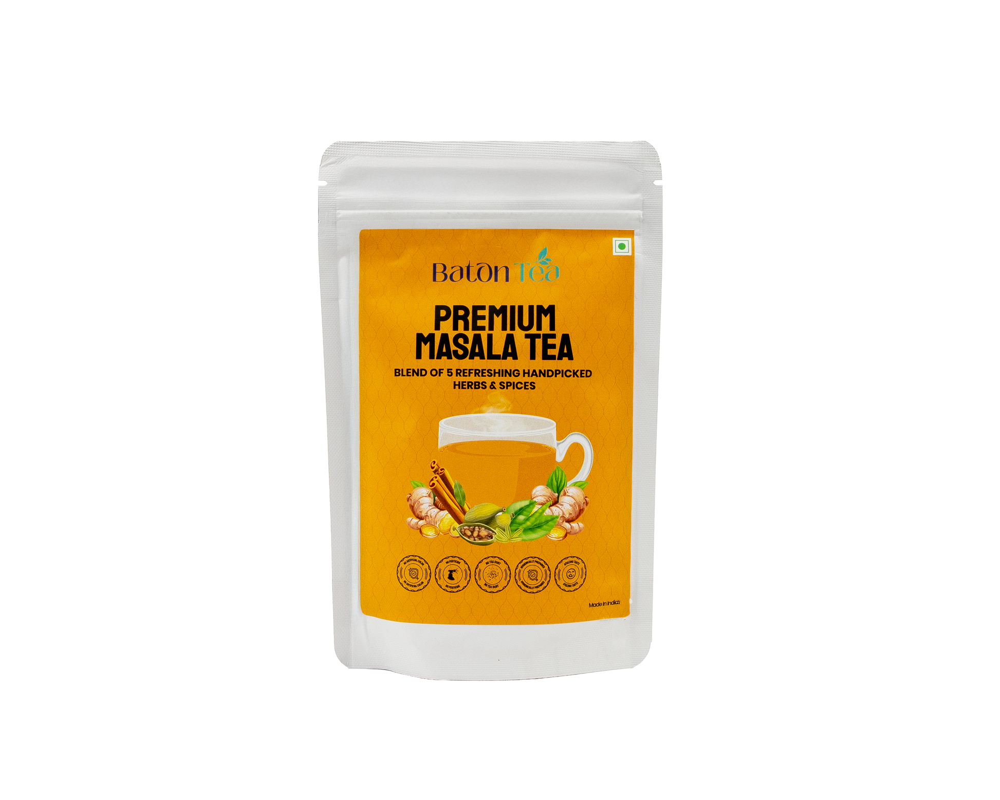 Baton Premium Masala Tea is a delightful fusion of robust Assam tea leaves and handpicked Indian spices. Carefully blended with ginger, cinnamon, cardamom, saunf, and rose petals, this tea offers a perfect balance of flavor, aroma, and health benefits. Whether you enjoy it plain or with milk, our masala chai is crafted to give you a refreshing, kadak cup every time.