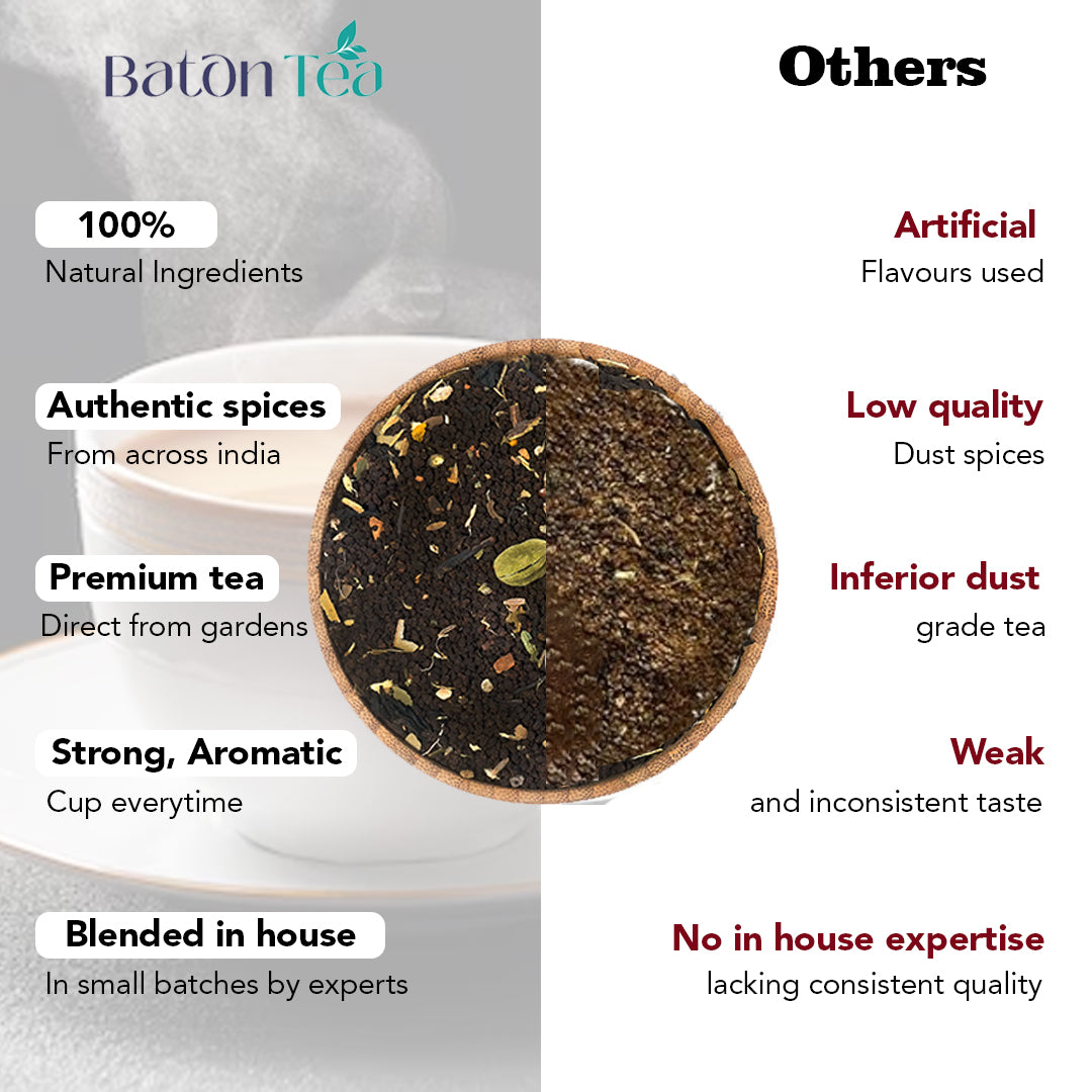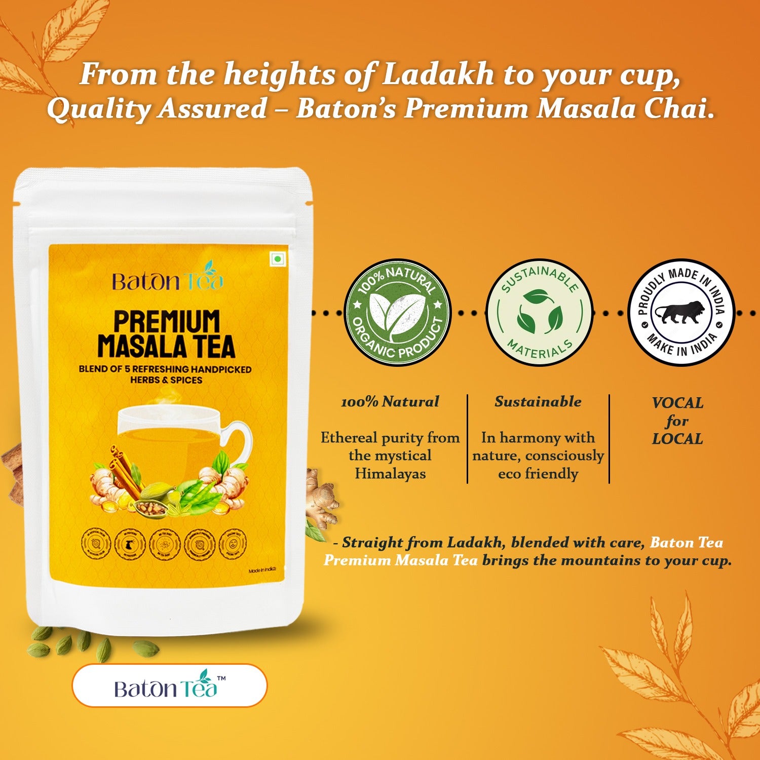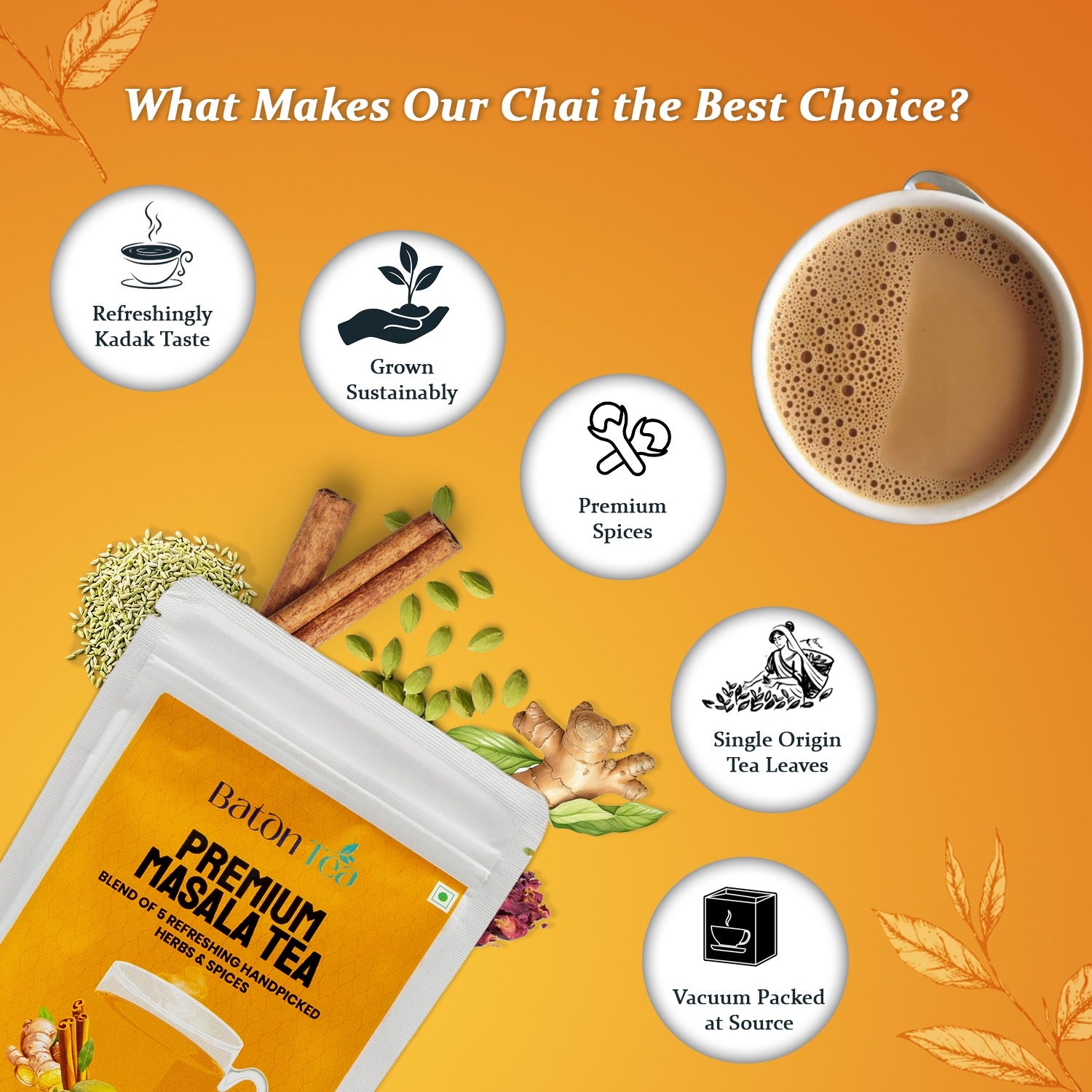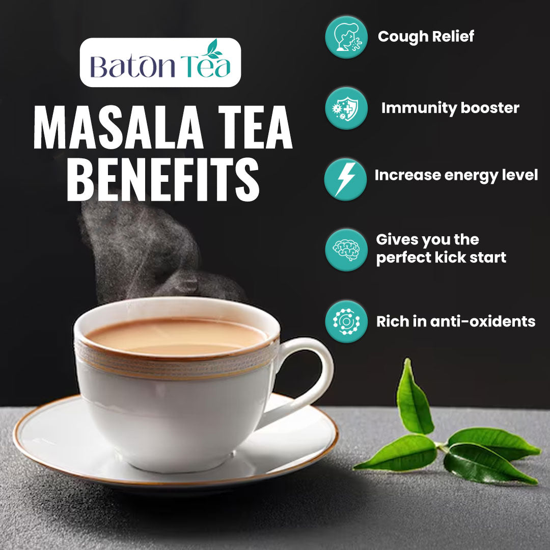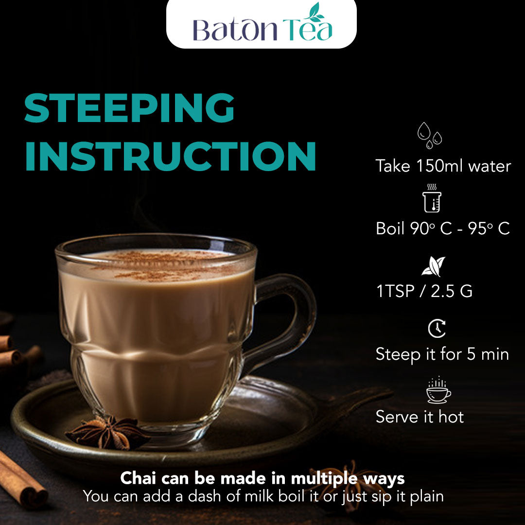 Baton Premium Masala Tea is a delightful fusion of robust Assam tea leaves and handpicked Indian spices. Carefully blended with ginger, cinnamon, cardamom, saunf, and rose petals, this tea offers a perfect balance of flavor, aroma, and health benefits. Whether you enjoy it plain or with milk, our masala chai is crafted to give you a refreshing, kadak cup every time.