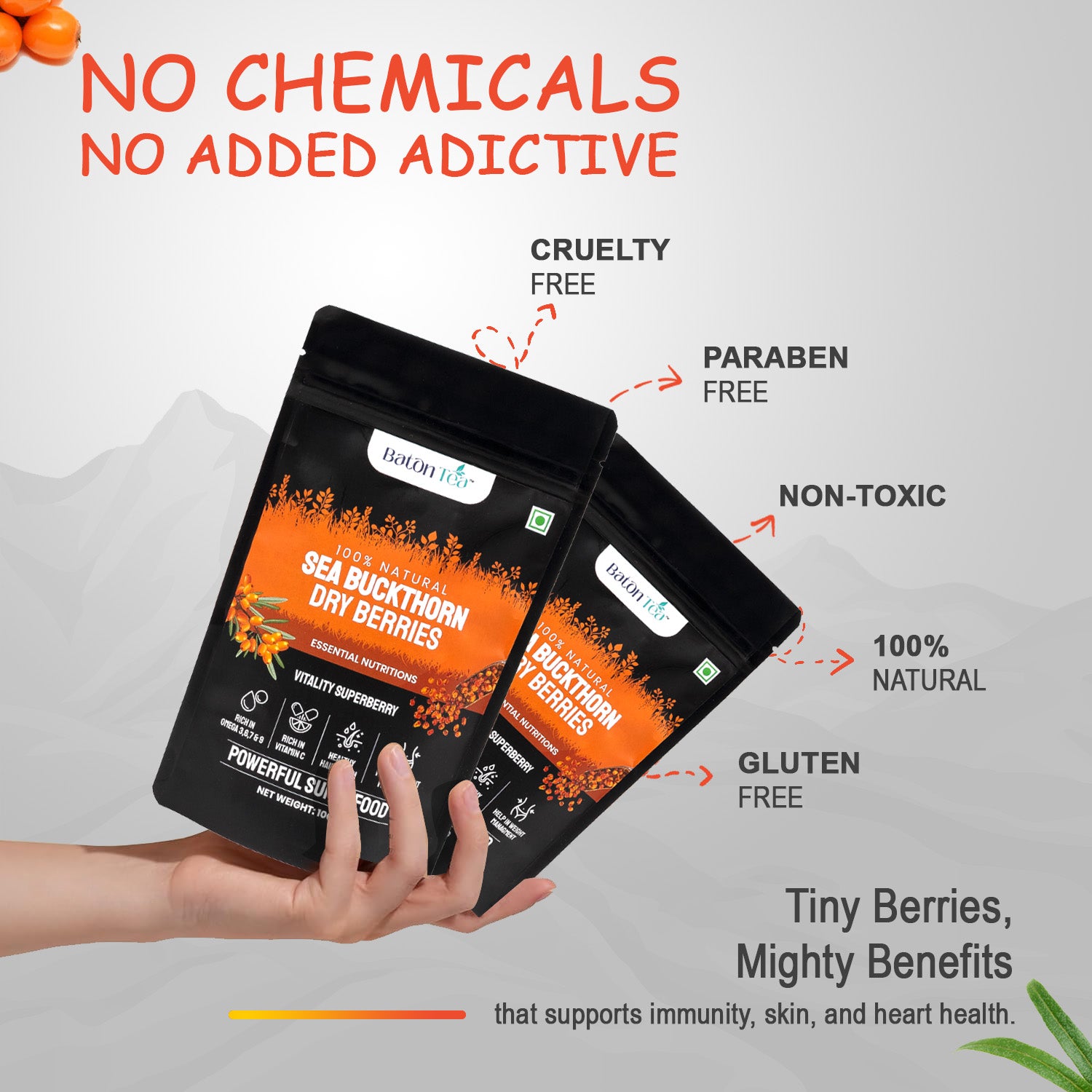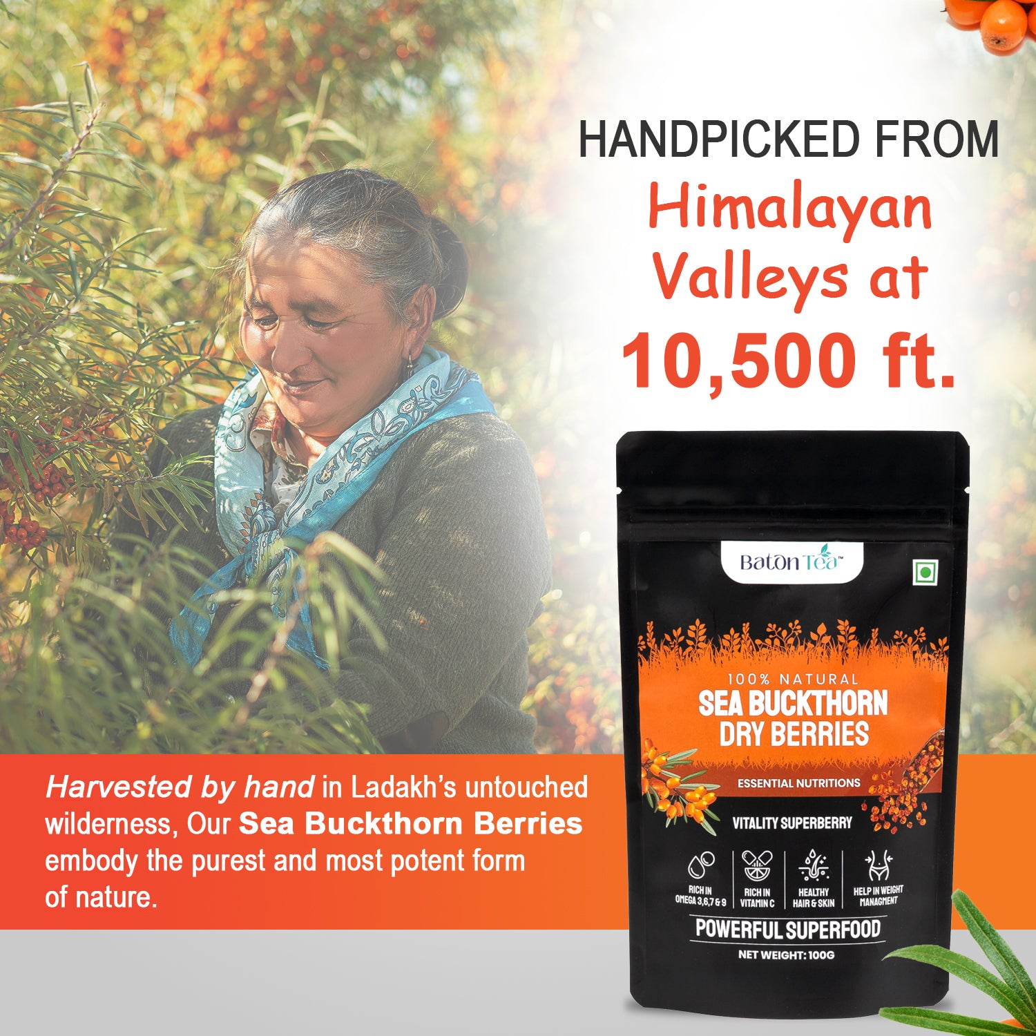 Grown in the untouched Himalayan valleys, Baton Tea’s Sea Buckthorn Berries are as pure as it gets.