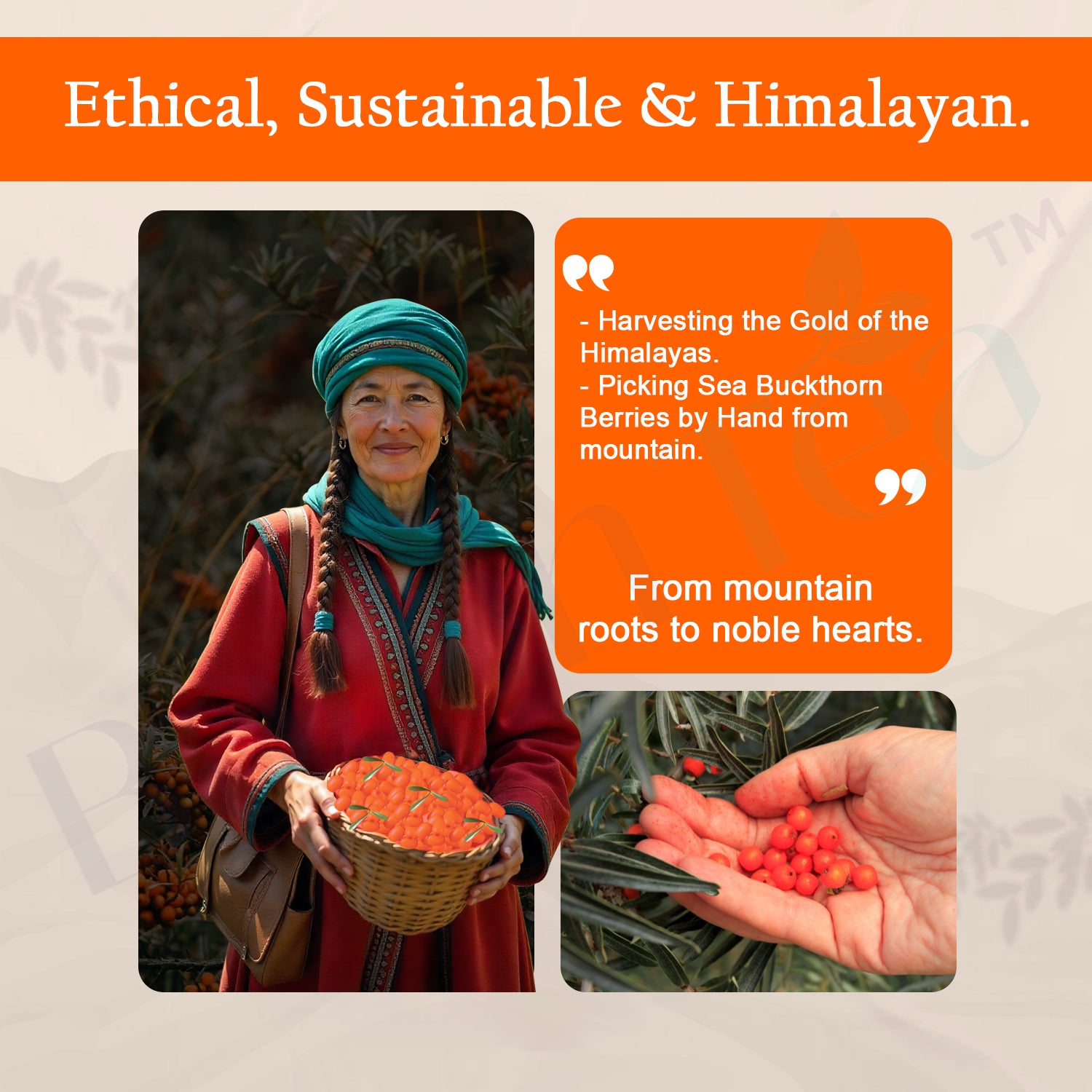 At Baton Tea, we work directly with local Himalayan communities to source wild, handpicked Sea Buckthorn berries. This ensures our Sea Buckthorn Pulp is: